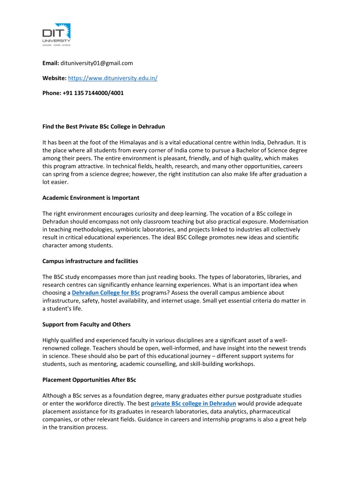 Email: dituniversity01@gmail.com Website: https://www.dituniversity.edu.in/ Phone: +91 135 7144000/4001 An Insight into DIT University Among the many options, DIT University has been steadily gaining a reputation as one of the top places for science education. It offers BSc specialisations in line with the current industry demand, within a state-of-the-art campus featuring modern teaching facilities and programmes. It doesn't end with theory; these directives are practical in developing the critical thinking and analytical skills that students need for postgraduate studies or employment. Student Life and Extracurricular Activities: College life is much beyond lectures. Strong campus life helps individuals develop. Schools, sports and cultural activities, with other social activities, create an environment that supports healthy socio-emotional development. A Dehradun College for BSc will promote all forms of student involvement outside the formal classroom environment, enhancing leadership and teamwork skills. Price Point and Scholarships Private education is an investment, but numerous colleges in Dehradun offer scholarships based on both merit and financial need. Students should attempt to obtain information from the college regarding financial assistance, tuition structure, and work-study opportunities. Affordability should not come at the expense of quality; some of the best colleges offer both affordability and quality. Alumni Networks and Industry Attachments The glory of any institution is oftentimes determined by how far its alumni have fared. Strong alum networks allow mentorship and job connections. Similarly, ties with research centres and companies broaden student visibility and pave the way for their future opportunities. Conclusion: Choice with Confidence The procedure of researching and validating the best private BSc college in Dehradun is a crucial aspect of every student's journey. When evaluating a university, academic quality, infrastructure, faculty, and future career prospects ought to be taken into consideration. If you have a penchant for pure sciences or applied research, Dehradun serves as an apt academic ecosystem to address all your needs. Institutions like DIT University create a marketplace for talent and opportunity, helping students realise a successful scientific career. Source: https://ext-5362930.livejournal.com/7572.html