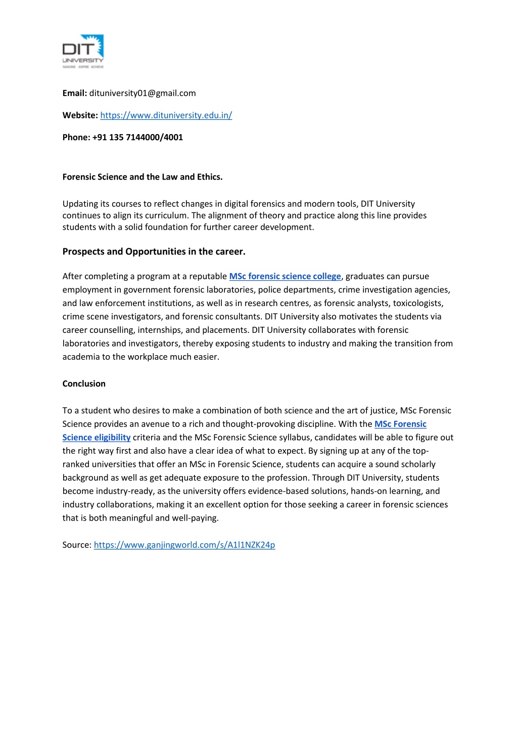 2. Email: dituniversity01@gmail.com Website: https://www.dituniversity.edu.in/ Phone: +91 135 7144000/4001 Forensic Science and the Law and Ethics. Updating its courses to reflect changes in digital forensics and modern tools, DIT University continues to align its curriculum. The alignment of theory and practice along this line provides students with a solid foundation for further career development. Prospects and Opportunities in the career. After completing a program at a reputable MSc forensic science college, graduates can pursue employment in government forensic laboratories, police departments, crime investigation agencies, and law enforcement institutions, as well as in research centres, as forensic analysts, toxicologists, crime scene investigators, and forensic consultants. DIT University also motivates the students via career counselling, internships, and placements. DIT University collaborates with forensic laboratories and investigators, thereby exposing students to industry and making the transition from academia to the workplace much easier. Conclusion To a student who desires to make a combination of both science and the art of justice, MSc Forensic Science provides an avenue to a rich and thought-provoking discipline. With the MSc Forensic Science eligibility criteria and the MSc Forensic Science syllabus, candidates will be able to figure out the right way first and also have a clear idea of what to expect. By signing up at any of the top- ranked universities that offer an MSc in Forensic Science, students can acquire a sound scholarly background as well as get adequate exposure to the profession. Through DIT University, students become industry-ready, as the university offers evidence-based solutions, hands-on learning, and industry collaborations, making it an excellent option for those seeking a career in forensic sciences that is both meaningful and well-paying. Source: https://www.ganjingworld.com/s/A1l1NZK24p