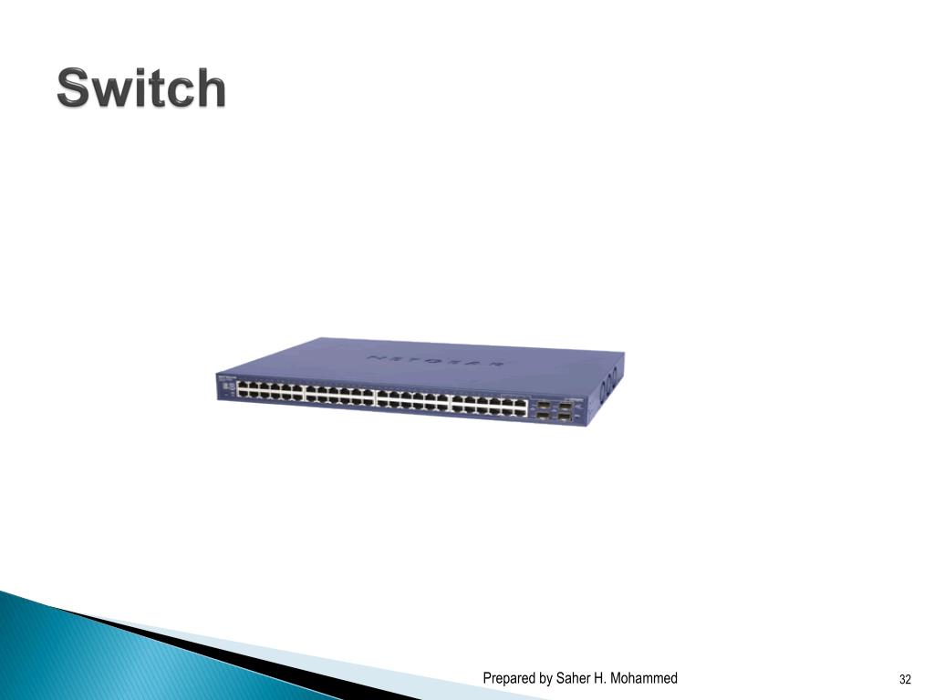 Switch • A switch is a special type of hub. • A switch is an active device. • Switch operates at the second layer (DLL) of OSI model. • A switch will forward the packets only the correct destination. • A switch will not divide the bandwidth, thus the transmission speed is higher. Prepared by Saher H. Mohammed