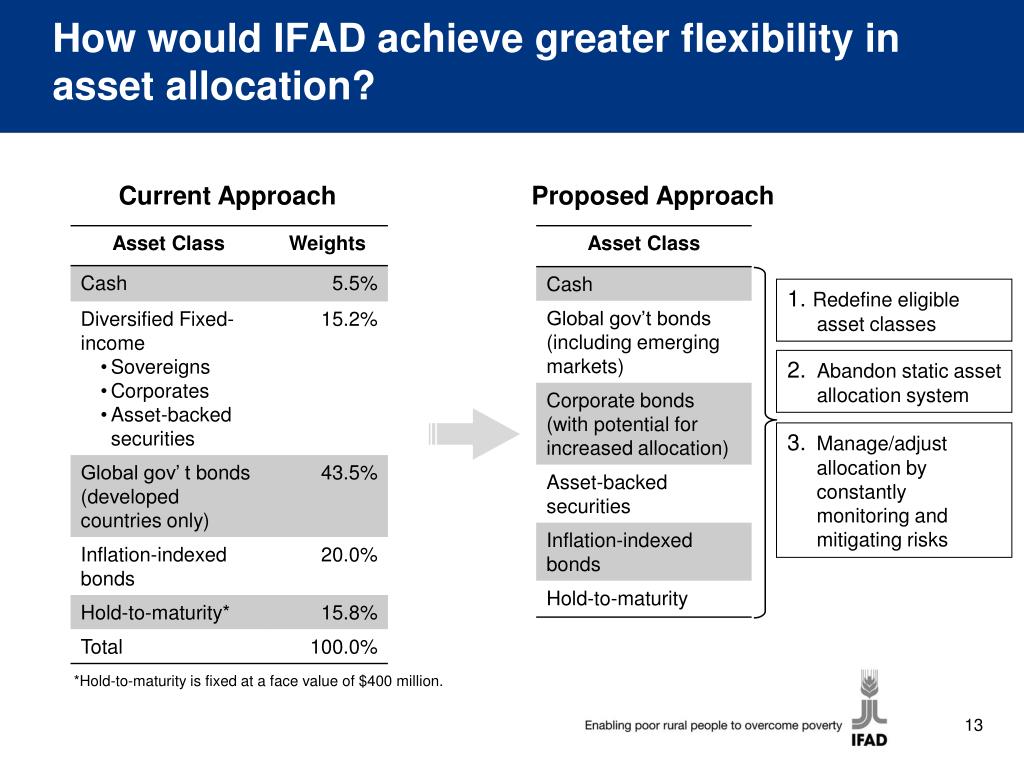 How would IFAD diversify? Including additional investment grade securities will contribute to reducing the high concentration riskin IFAD’s portfolio. Current approach Proposed approach • 1. Sovereign floor of BBB- Eligible Issuers Sovereign Ratings Eligible Issuers Sovereign Ratings • 2. Corporate floor of A- AAA Developed markets Countries with eligible ratings and strong fundamentals AAA AA+ AA+ • 3. No “junk bonds” AA AA Highly correlated assets • 4. Only strong macro fundamentals AA- Current policy floor AA- A+ • 5. Only SDR-linked currencies A+ Legacy HTM and countries with multiple ratings Expand issuer universe A A A- A- BBB+ Less correlated with Developed markets BBB BBB- 12