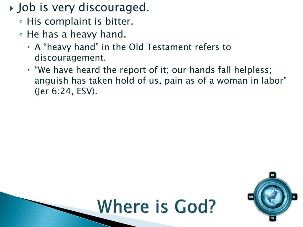 Job is very discouraged. • His complaint is bitter. • He has a heavy hand. • A “heavy hand” in the Old Testament refers to discouragement. • “We have heard the report of it; our hands fall helpless; anguish has taken hold of us, pain as of a woman in labor” (Jer 6:24, ESV).