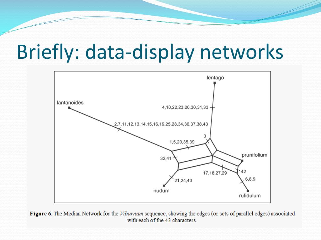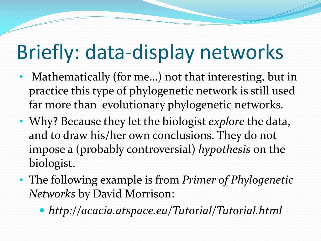 Briefly: data-display networks • Mathematically (for me…) not that interesting, but in practice this type of phylogenetic network is still used far more than evolutionary phylogenetic networks. • Why? Because they let the biologist explore the data, and to draw his/her own conclusions. They do not impose a (probably controversial) hypothesis on the biologist. • The following example is from Primer of Phylogenetic Networks by David Morrison: • http://acacia.atspace.eu/Tutorial/Tutorial.html