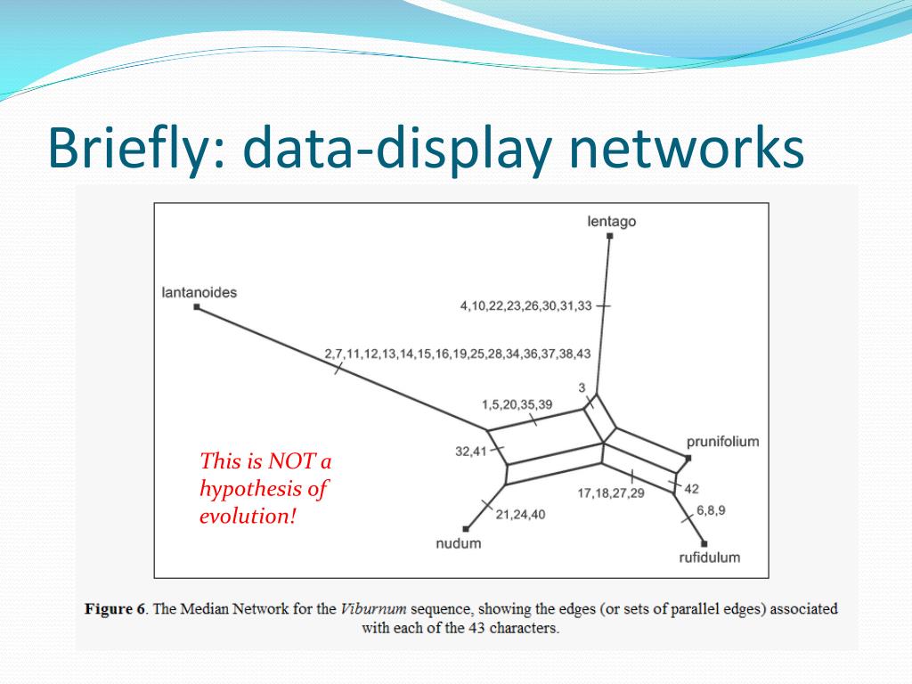 Phylogenetic networks: 2 types “Data display” / unrooted networks Evolutionary / rooted /explicit networks No explicit model of evolution: tries to graphically represent where the data is non-treelike. Does not generate a hypothesis of “what happened”. Tries to model the events that caused the data to be non-treelike. Tries – in some limited way – to generate a hypothesis of “what happened”.