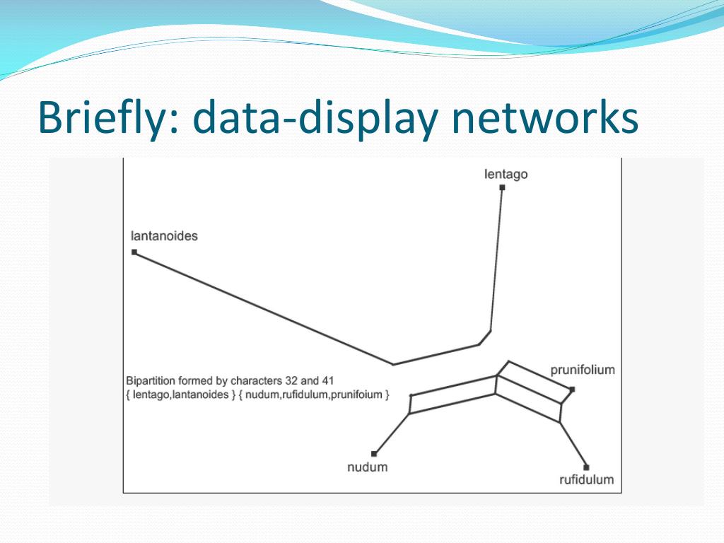 Briefly: data-display networks • The network on the previous page simultaneously shows multiple bipartitions (“splits”) of the input data. • Each parallel set of edges, when removed, induces such a split. • Where do these splits come from? • DNA data where, per site, at most two different character states are observed (ranging across the species), can be used for this.