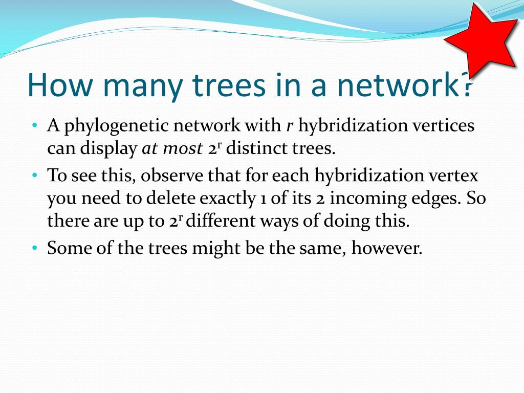 How many trees in a network? • A phylogenetic network with r hybridization vertices can display at most 2r distinct trees. • To see this, observe that for each hybridization vertex you need to delete exactly 1 of its 2 incoming edges. So there are up to 2r different ways of doing this. • Some of the trees might be the same, however.