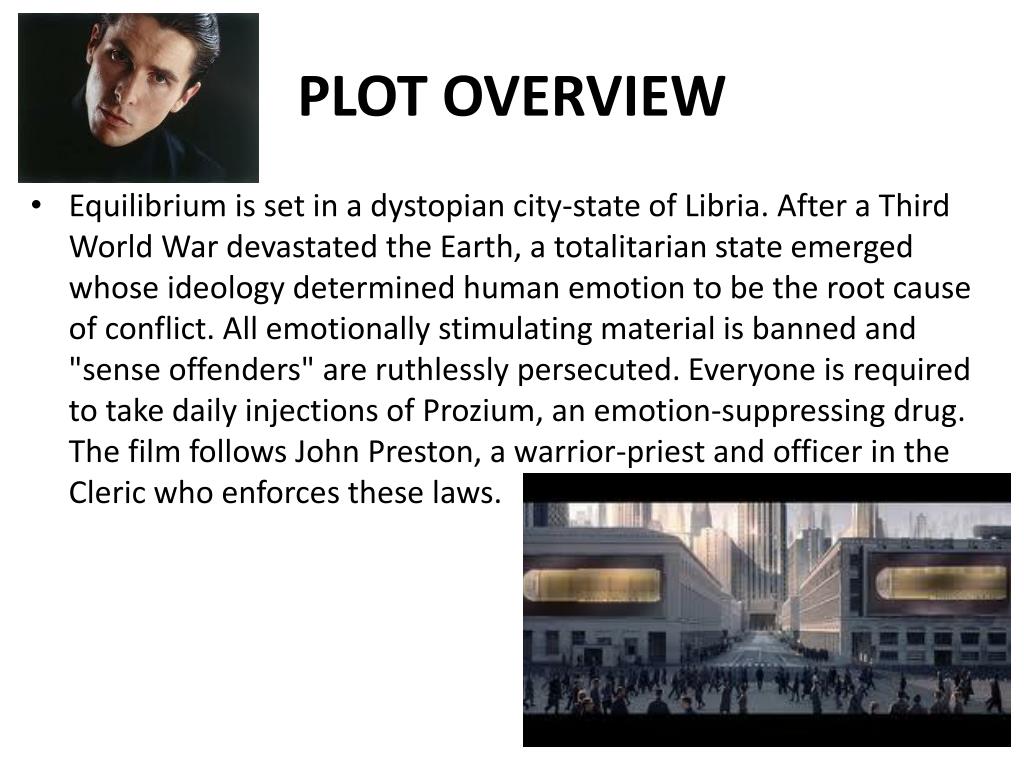 PLOT OVERVIEW • Equilibrium is set in a dystopian city-state of Libria. After a Third World War devastated the Earth, a totalitarian state emerged whose ideology determined human emotion to be the root cause of conflict. All emotionally stimulating material is banned and "sense offenders" are ruthlessly persecuted. Everyone is required to take daily injections of Prozium, an emotion-suppressing drug. The film follows John Preston, a warrior-priest and officer in the Cleric who enforces these laws.