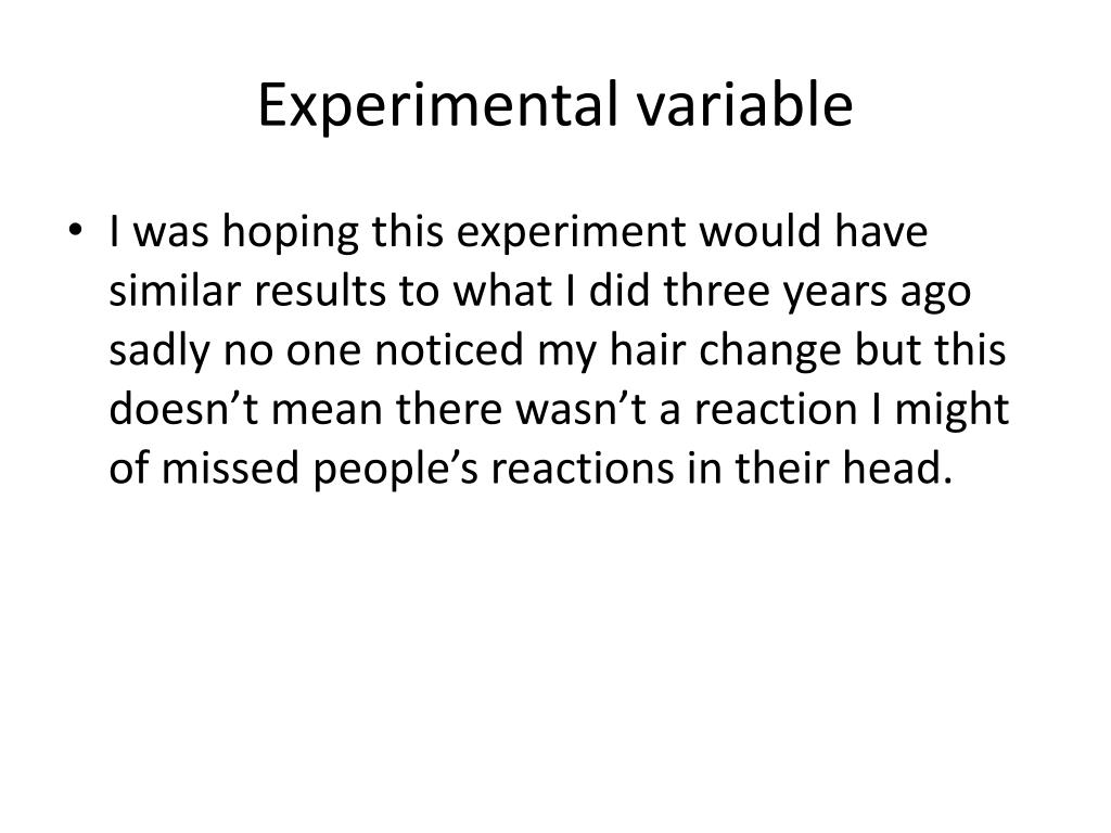 Experimental variable • I was hoping this experiment would have similar results to what I did three years ago sadly no one noticed my hair change but this doesn’t mean there wasn’t a reaction I might of missed people’s reactions in their head.
