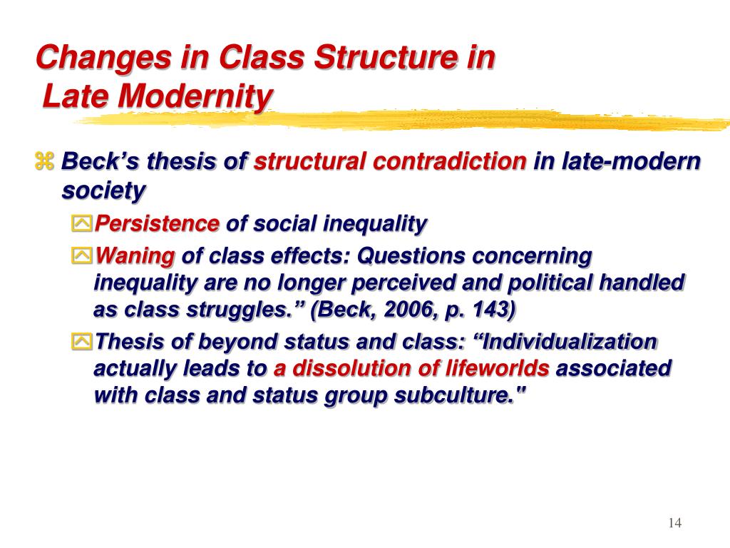 Changes in Class Structure in Late Modernity • Beck’s thesis of structural contradiction in late-modern society • Persistence of social inequality • Waning of class effects: Questions concerning inequality are no longer perceived and political handled as class struggles.” (Beck, 2006, p. 143) • Thesis of beyond status and class: “Individualization actually leads to a dissolution of lifeworlds associated with class and status group subculture."