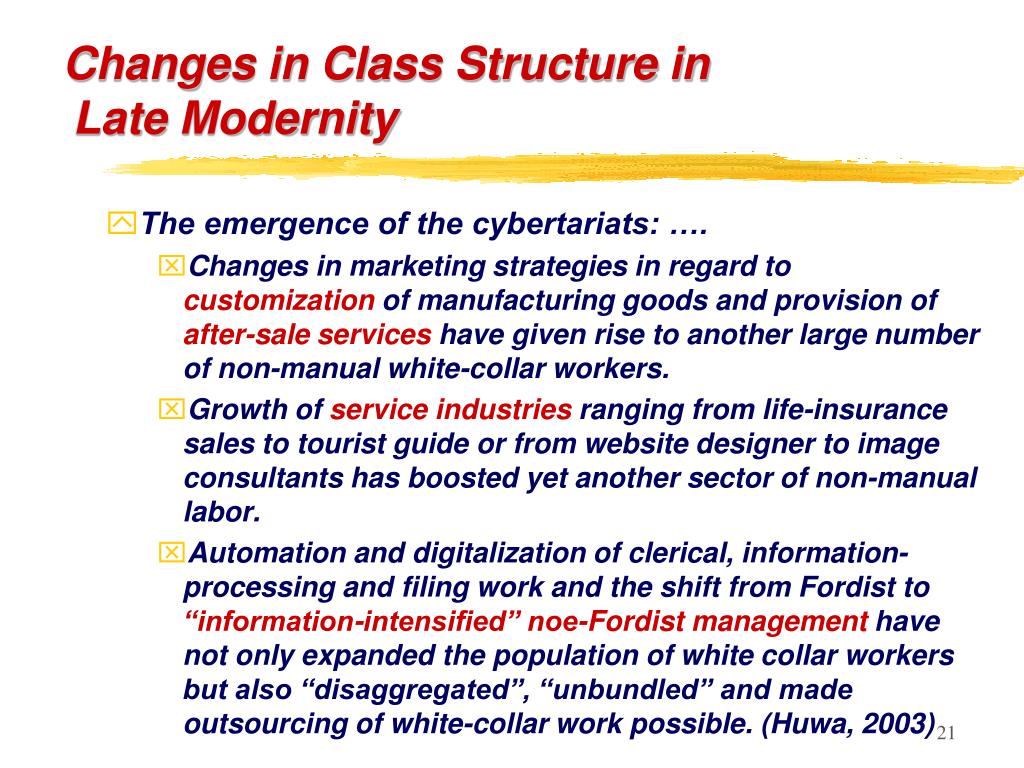 Changes in Class Structure in Late Modernity • The emergence of the cybertariats: …. • Changes in marketing strategies in regard to customization of manufacturing goods and provision of after-sale services have given rise to another large number of non-manual white-collar workers. • Growth of service industries ranging from life-insurance sales to tourist guide or from website designer to image consultants has boosted yet another sector of non-manual labor. • Automation and digitalization of clerical, information-processing and filing work and the shift from Fordist to “information-intensified” noe-Fordist management have not only expanded the population of white collar workers but also “disaggregated”, “unbundled” and made outsourcing of white-collar work possible. (Huwa, 2003)