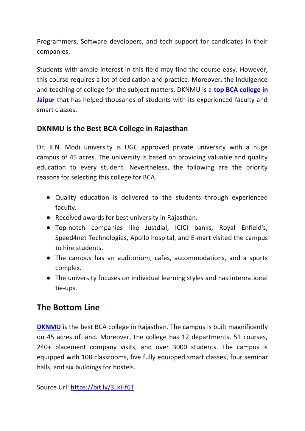 Programmers, Software developers, and tech support for candidates in their companies. Students with ample interest in this field may find the course easy. However, this course requires a lot of dedication and practice. Moreover, the indulgence and teaching of college for the subject matters. DKNMU is a top BCA college in Jaipur that has helped thousands of students with its experienced faculty and smart classes. DKNMU is the Best BCA College in Rajasthan Dr. K.N. Modi university is UGC approved private university with a huge campus of 45 acres. The university is based on providing valuable and quality education to every student. Nevertheless, the following are the priority reasons for selecting this college for BCA. ●Quality education is delivered to the students through experienced faculty. ●Received awards for best university in Rajasthan. ●Top-notch companies like Justdial, ICICI banks, Royal Enfield's, Speed4net Technologies, Apollo hospital, and E-mart visited the campus to hire students. ●The campus has an auditorium, cafes, accommodations, and a sports complex. ●The university focuses on individual learning styles and has international tie-ups. The Bottom Line DKNMU is thebest BCA college in Rajasthan. The campus is built magnificently on 45 acres of land. Moreover, the college has 12 departments, 51 courses, 240+ placement company visits, and over 3000 students. The campus is equipped with 108 classrooms, five fully equipped smart classes, four seminar halls, and six buildings for hostels. Source Url: https://bit.ly/3LkHf6T