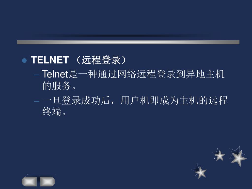 TELNET (远程登录) • Telnet是一种通过网络远程登录到异地主机的服务。 • 一旦登录成功后,用户机即成为主机的远程终端。