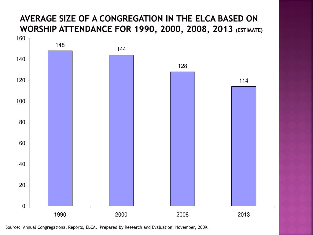 Average Size of a Congregation in the ELCA Based on Worship Attendance for 1990, 2000, 2008, 2013 (estimate) Source: Annual Congregational Reports, ELCA. Prepared by Research and Evaluation, November, 2009.