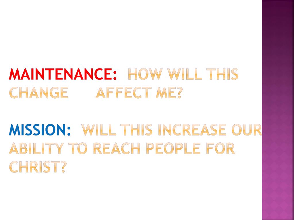 Maintenance: How will this change affect me?Mission: Will this increase our ability to reach people for Christ?