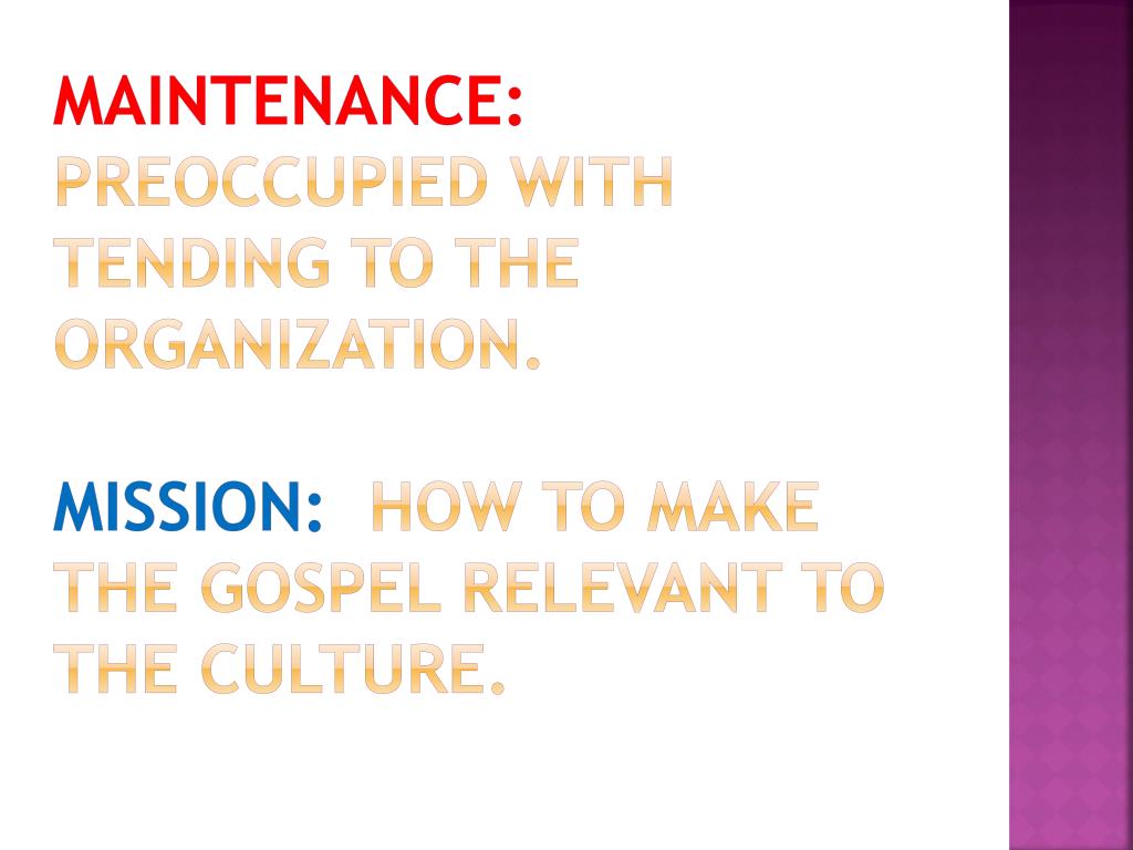 Maintenance: Preoccupied with tending to the organization. Mission: How to make the gospel relevant to the culture.