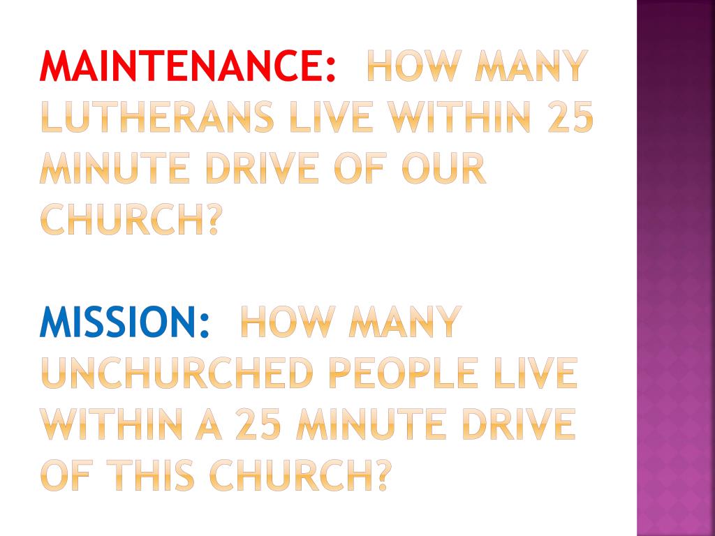 Maintenance: How many Lutherans live within 25 minute drive of our church?Mission: How many unchurched people live within a 25 minute drive of this church?