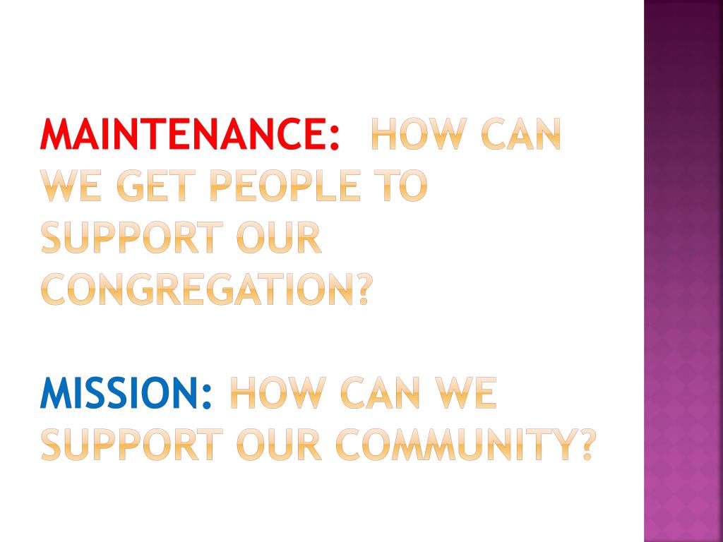 Maintenance: How can we get people to support our congregation?Mission: How can we support our community?