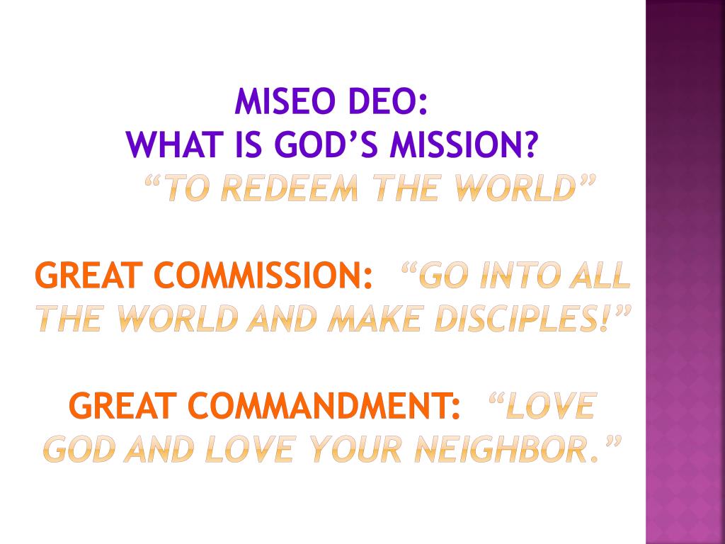 MiseoDeo: What is God’s Mission? “TO REDEEM THE WORLD”Great Commission:“Go into all the world and make disciples!”Great Commandment:“Love God and love your neighbor.”