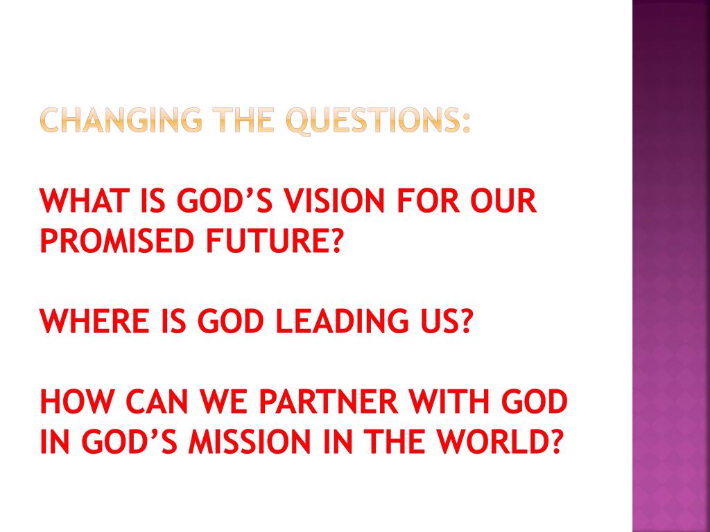 Changing the questionS:What is god’s vision for our PROMISED future? Where is God LEADING US?HOW CAN WE PARTNER WITH GOD IN GOD’S MISSION IN THE WORLD?