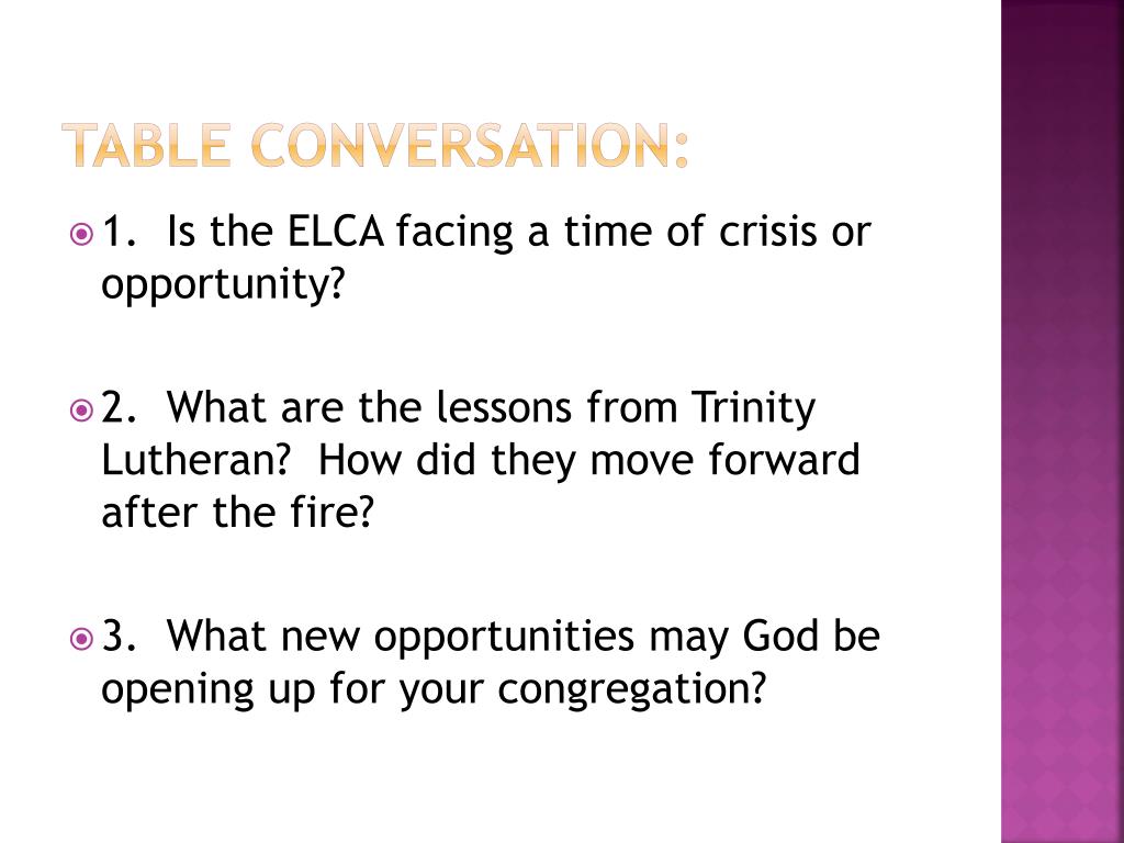 TABLE CONVERSATION: • 1. Is the ELCA facing a time of crisis or opportunity? • 2. What are the lessons from Trinity Lutheran? How did they move forward after the fire? • 3. What new opportunities may God be opening up for your congregation?