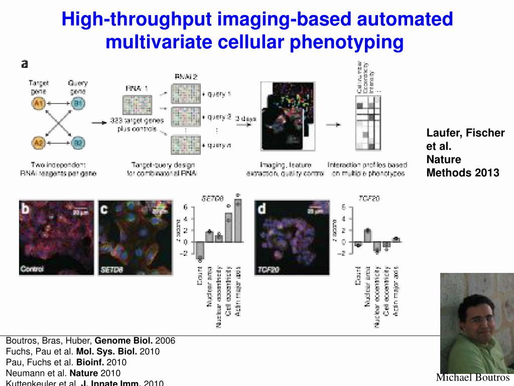 High-throughput imaging-based automated multivariate cellular phenotyping Laufer, Fischer et al. Nature Methods 2013 Boutros, Bras, Huber, Genome Biol. 2006 Fuchs, Pau et al. Mol. Sys. Biol. 2010 Pau, Fuchs et al. Bioinf. 2010 Neumann et al. Nature 2010 Kuttenkeuler et al. J. Innate Imm. 2010 Axelsson et al. BMC Bioinf. 2011 Horn et al. Nature Methods 2011 Laufer et al. Nature Methods 2013 Michael Boutros