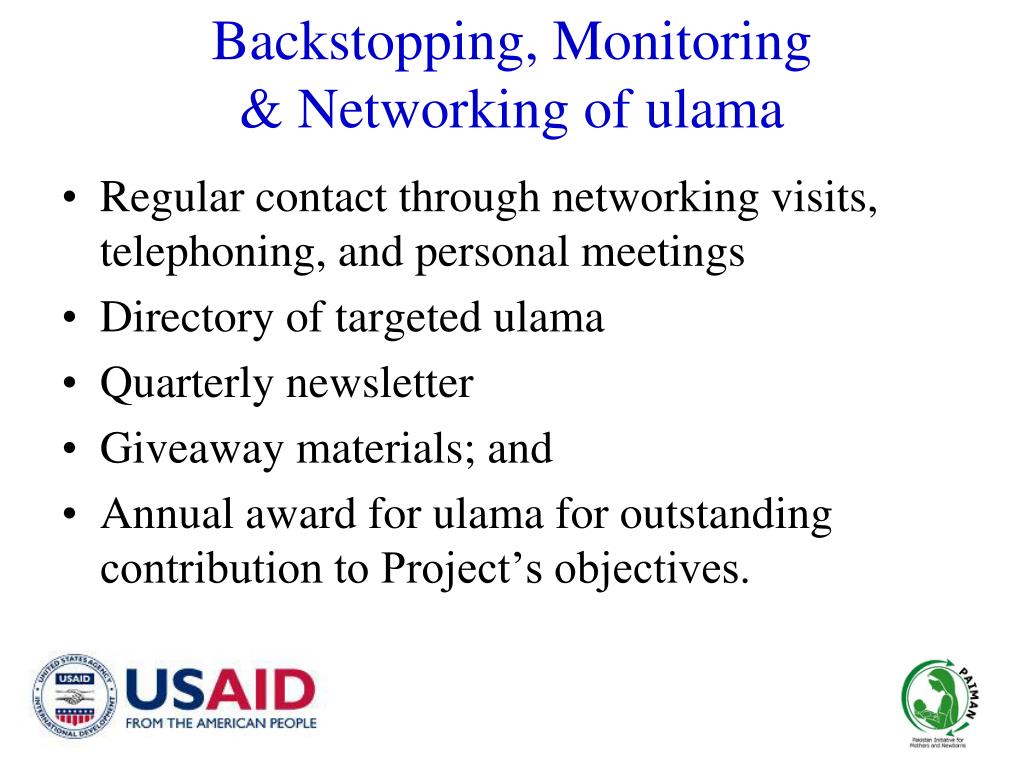 Backstopping, Monitoring & Networking of ulama • Regular contact through networking visits, telephoning, and personal meetings • Directory of targeted ulama • Quarterly newsletter • Giveaway materials; and • Annual award for ulama for outstanding contribution to Project’s objectives.