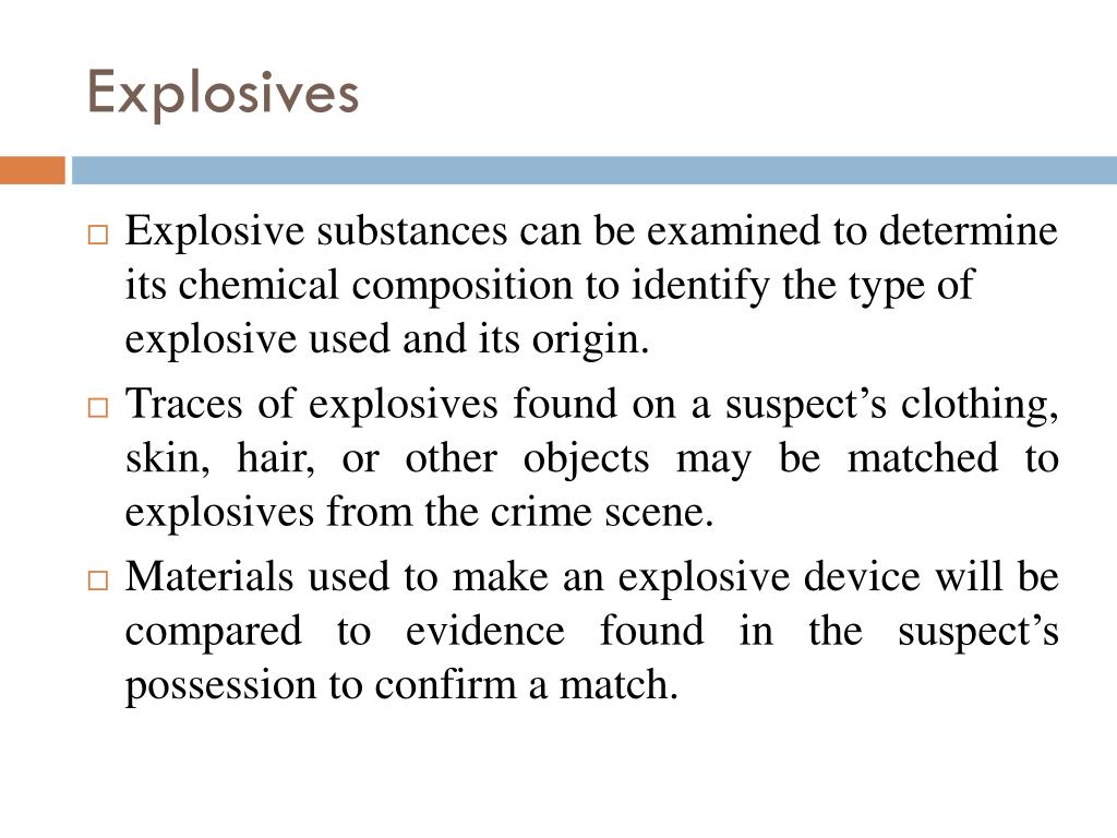 Explosives • Explosive substances can be examined to determine its chemical composition to identify the type of explosive used and its origin. • Traces of explosives found on a suspect’s clothing, skin, hair, or other objects may be matched to explosives from the crime scene. • Materials used to make an explosive device will be compared to evidence found in the suspect’s possession to confirm a match.