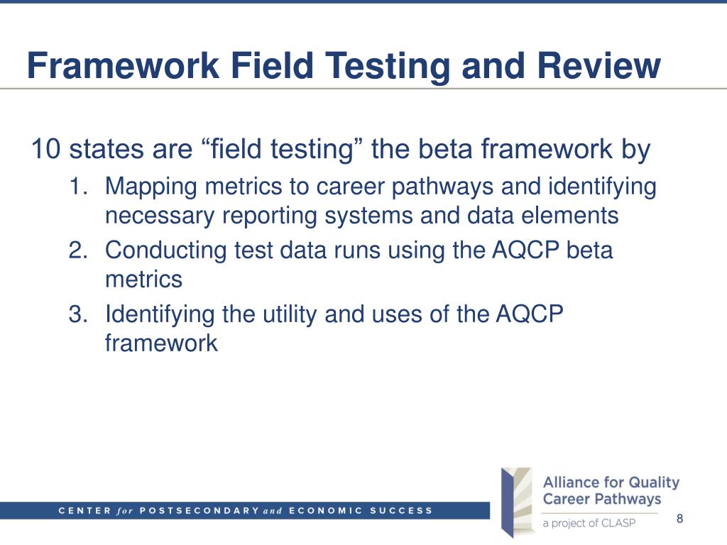 Framework Field Testing and Review 10 states are “field testing” the beta framework by • Mapping metrics to career pathways and identifying necessary reporting systems and data elements • Conducting test data runs using the AQCP beta metrics • Identifying the utility and uses of the AQCP framework