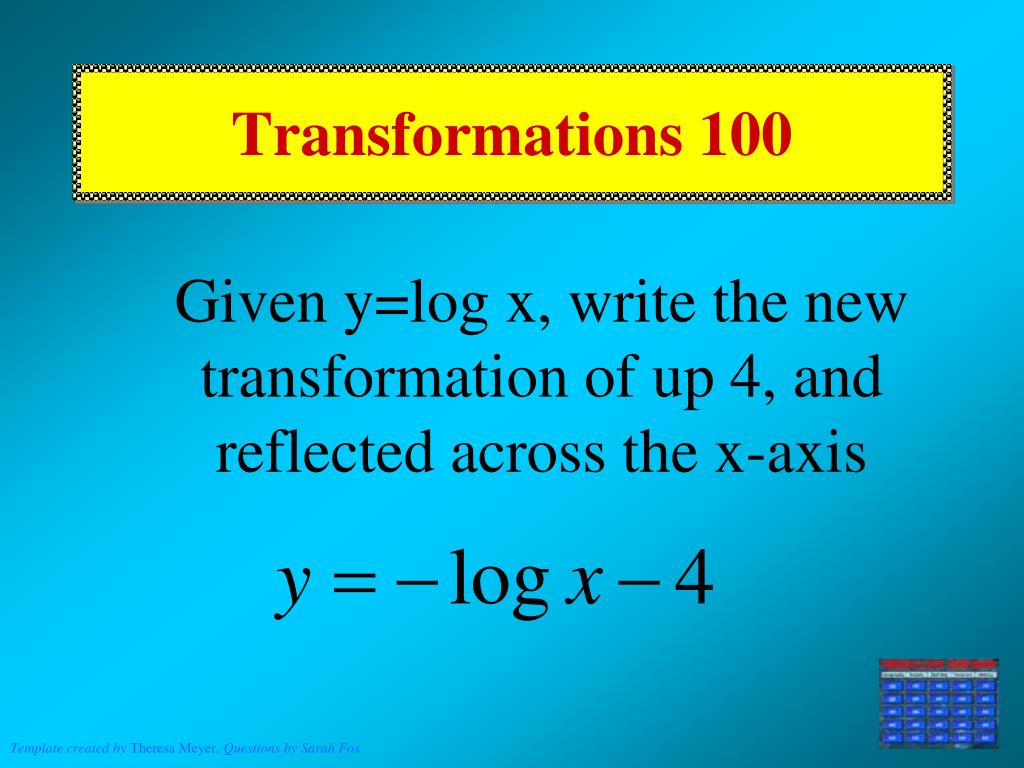 Transformations 100 Given y=log x, write the new transformation of up 4, and reflected across the x-axis