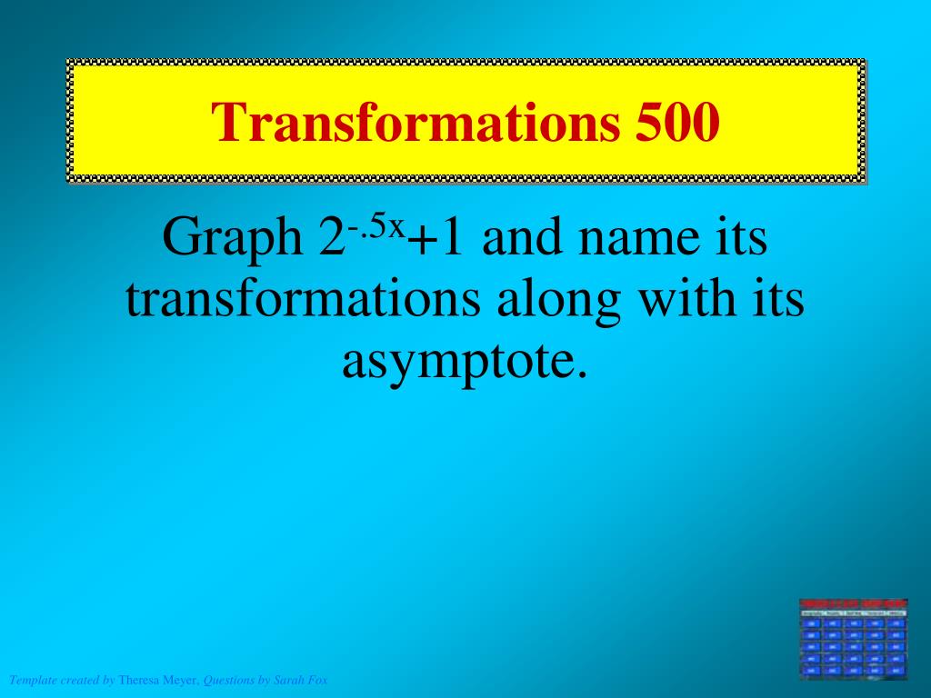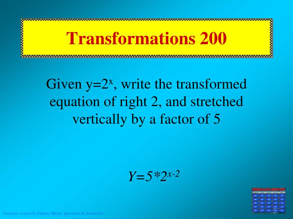 Transformations 200 Given y=2x, write the transformed equation of right 2, and stretched vertically by a factor of 5 Y=5*2x-2
