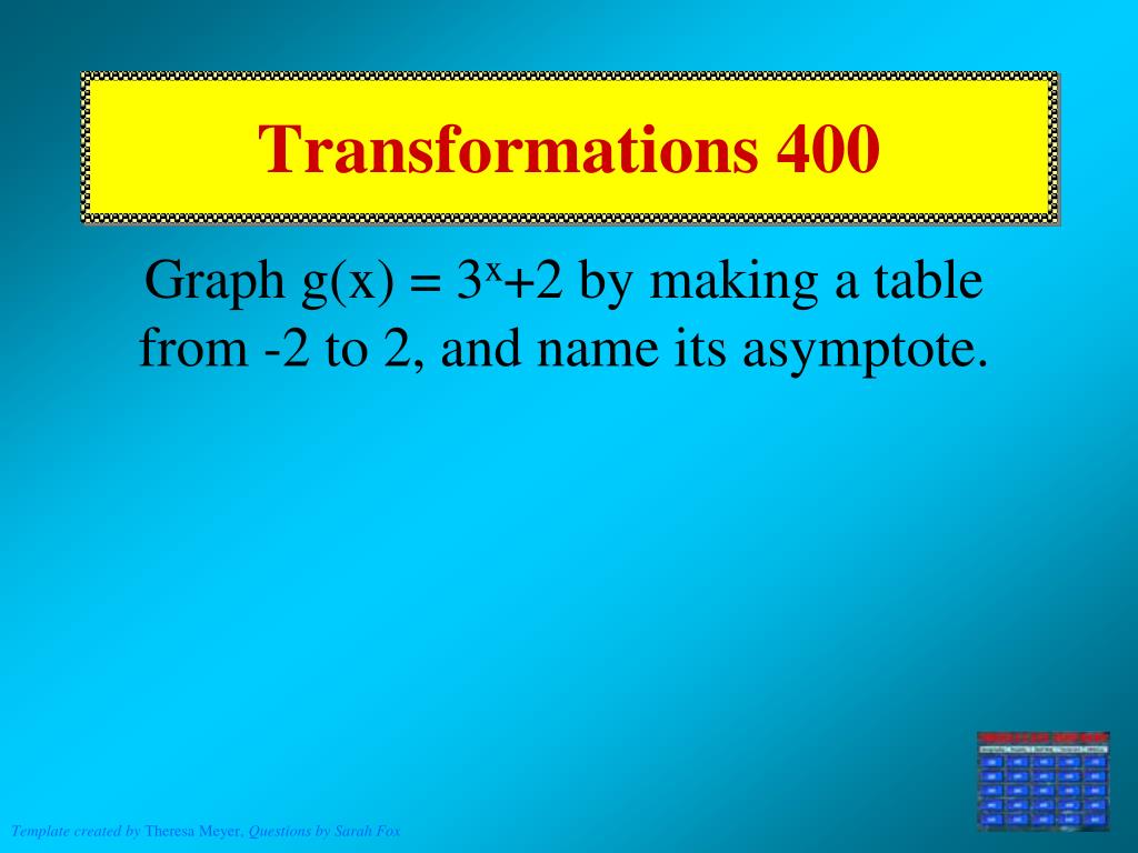 Transformations 400 Graph g(x) = 3x+2 by making a table from -2 to 2, and name its asymptote.