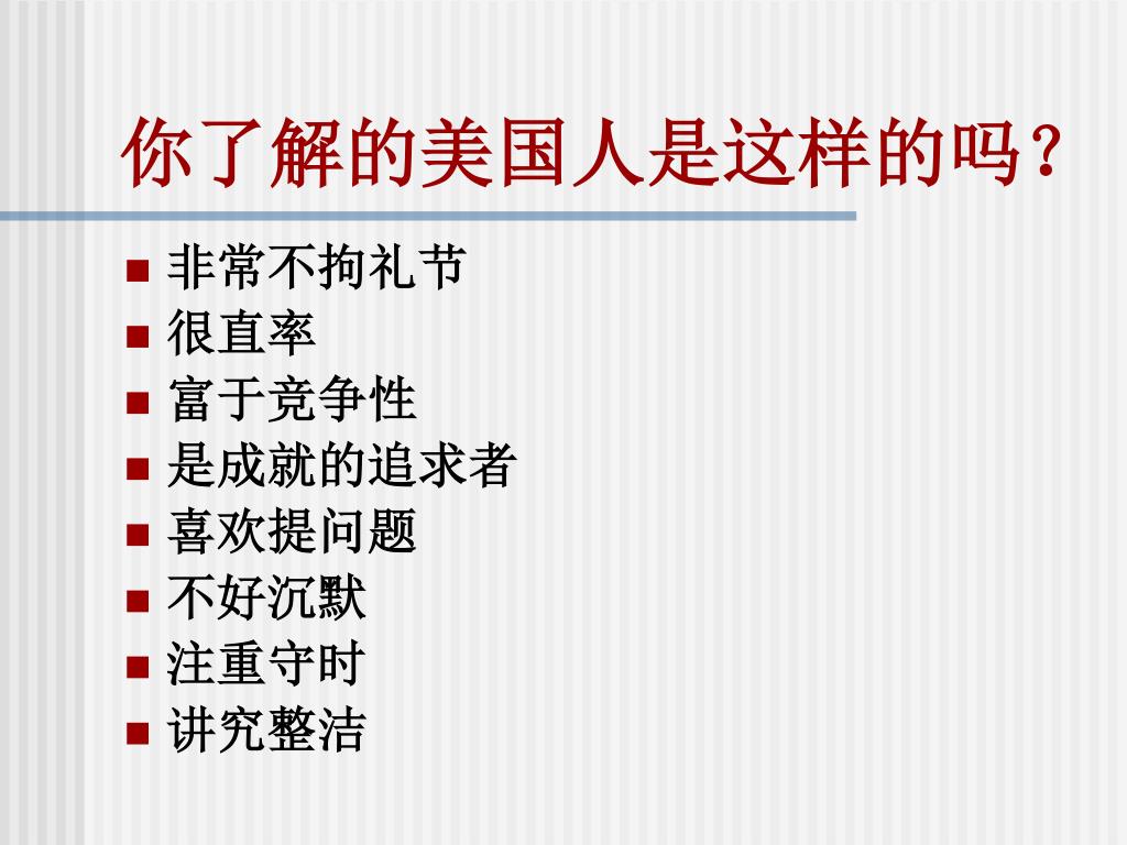 你了解的美国人是这样的吗? • 非常不拘礼节 • 很直率 • 富于竞争性 • 是成就的追求者 • 喜欢提问题 • 不好沉默 • 注重守时 • 讲究整洁