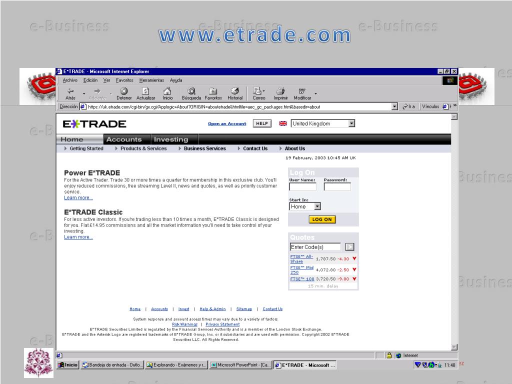 Business to consumer B2C • Intermediarios de información • Agentes que proporcionan servicios de valor añadido por medio de Internet • Búsqueda de información • Asesoramiento en la bolsa • transacciones • .... • Ejemplos • www.google.com • www.etrade.com