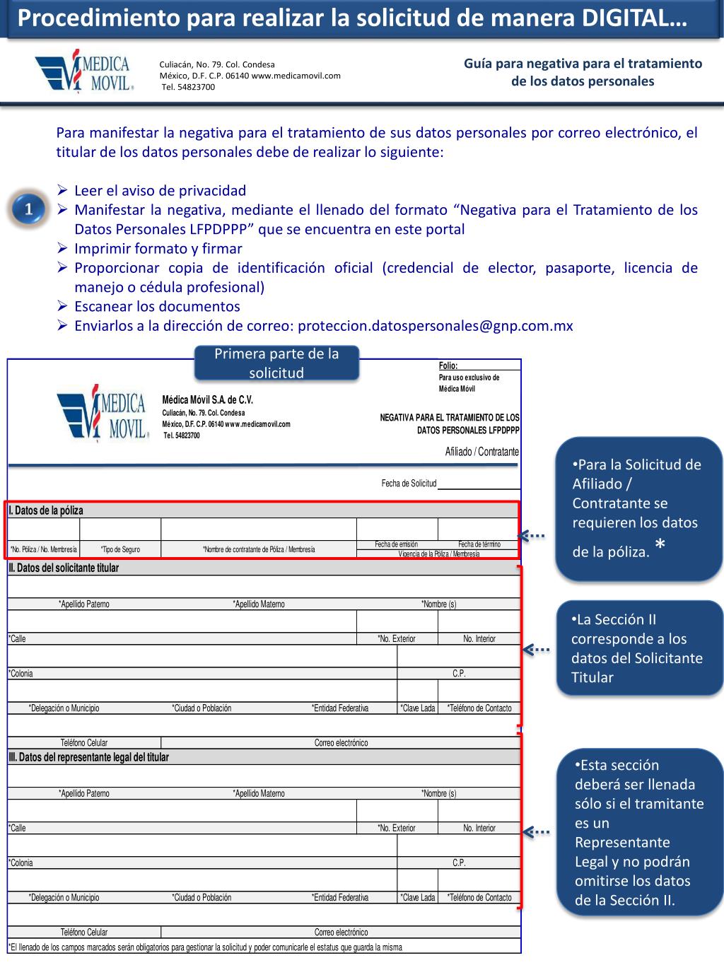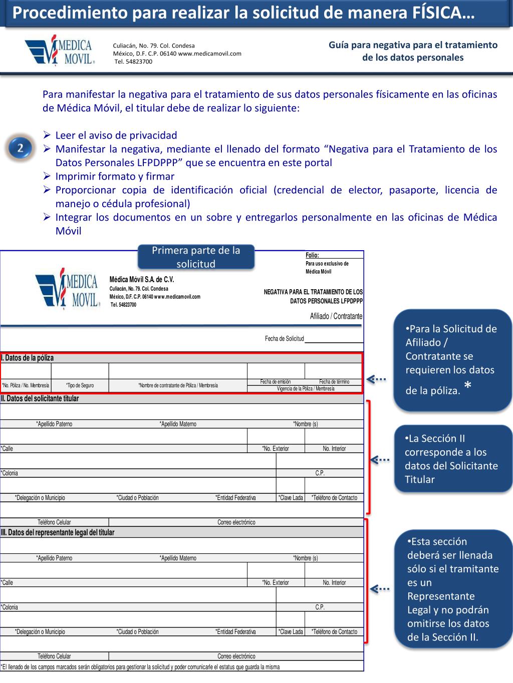 Procedimiento para realizar la solicitud de manera FÍSICA… • Para manifestar la negativa para el tratamiento de sus datos personales físicamente en las oficinas de Médica Móvil, el titular debe de realizar lo siguiente: • Leer el aviso de privacidad • Manifestar la negativa, mediante el llenado del formato “Negativa para el Tratamiento de los Datos Personales LFPDPPP” que se encuentra en este portal • Imprimir formato y firmar • Proporcionar copia de identificación oficial (credencial de elector, pasaporte, licencia de manejo o cédula profesional) • Integrar los documentos en un sobre y entregarlos personalmente en las oficinas de Médica Móvil 2 Primera parte de la solicitud • Para la Solicitud de Afiliado / Contratante se requieren los datos de la póliza. * • La Sección II corresponde a los datos del Solicitante Titular • Esta sección deberá ser llenada sólo si el tramitante es un Representante Legal y no podrán omitirse los datos de la Sección II. 2