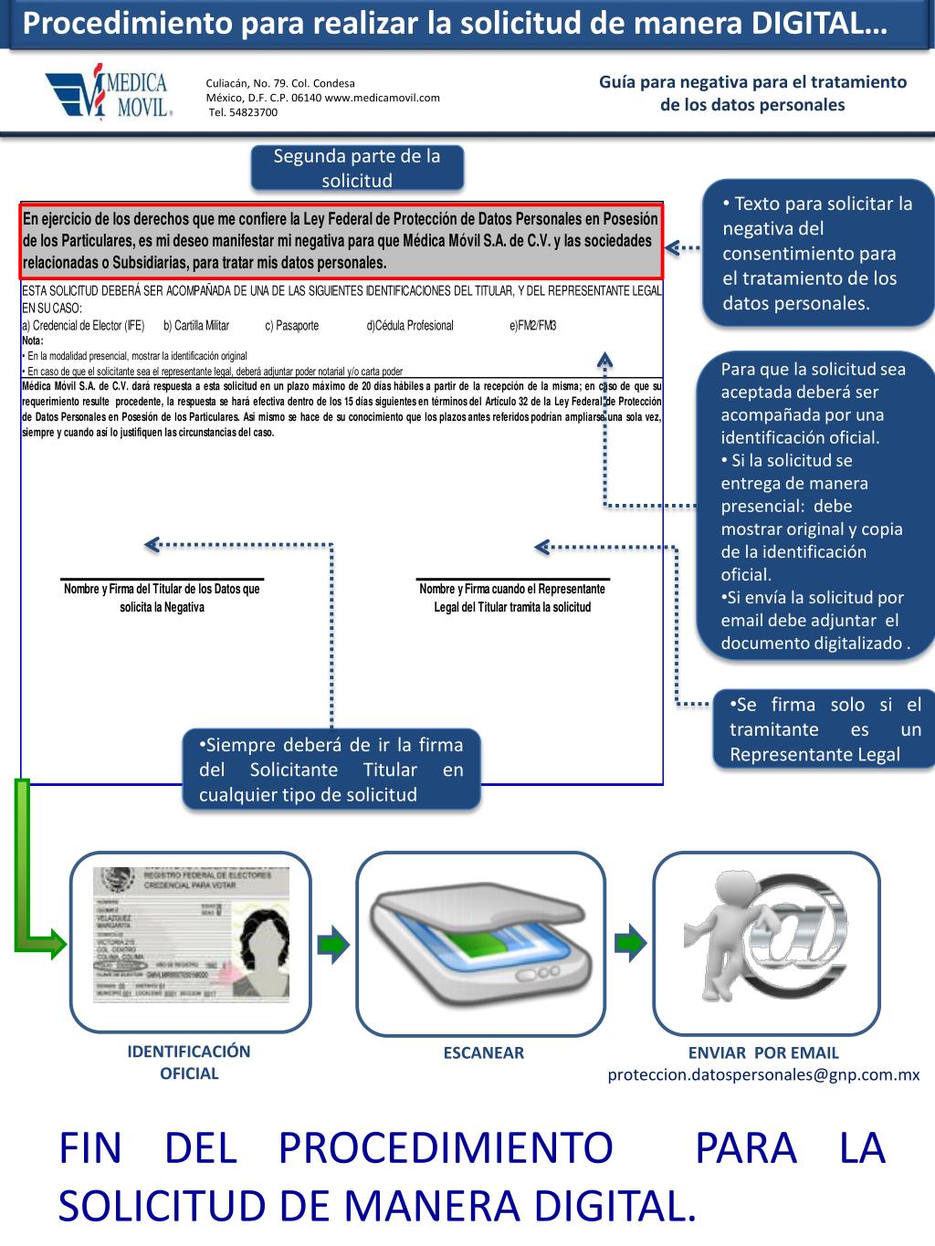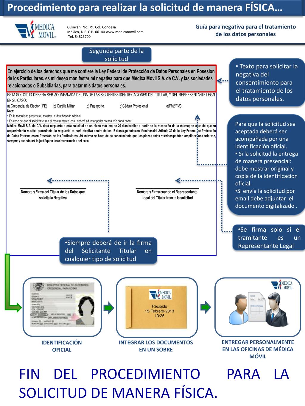 Procedimiento para realizar la solicitud de manera FÍSICA… Segunda parte de la solicitud • Texto para solicitar la negativa del consentimiento para el tratamiento de los datos personales. • Para que la solicitud sea aceptada deberá ser acompañada por una identificación oficial. • Si la solicitud la entrega de manera presencial: debe mostrar original y copia de la identificación oficial. • Si envía la solicitud por email debe adjuntar el documento digitalizado . Recibido 15-Febrero-2013 13:25 • Se firma solo si el tramitante es un Representante Legal • Siempre deberá de ir la firma del Solicitante Titular en cualquier tipo de solicitud ENTREGAR PERSONALMENTE EN LAS OFICINAS DE MÉDICA MÓVIL INTEGRAR LOS DOCUMENTOS EN UN SOBRE IDENTIFICACIÓN OFICIAL FIN DEL PROCEDIMIENTO PARA LA SOLICITUD DE MANERA FÍSICA.