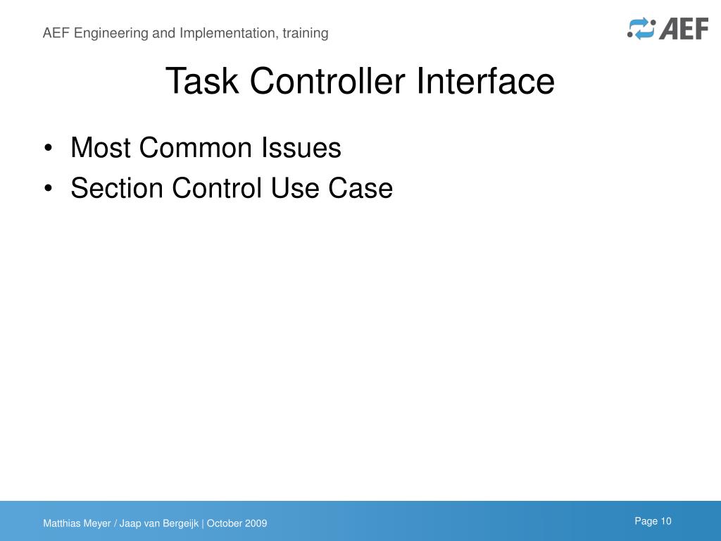 Welcome to AEF Think ISOBUS …. Task Controller Interface. Most Common Issues Section Control Example. TC interface, most common issues. Start of communication TC Version Number Check if you want to use features that came around in a certain version.