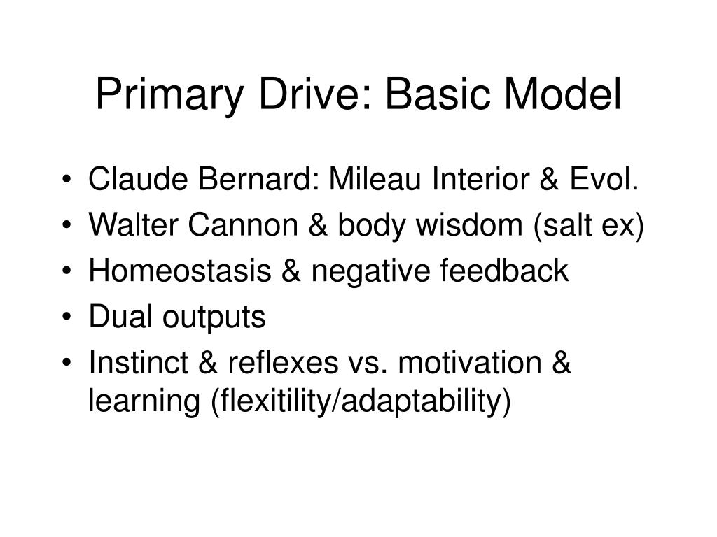 Primary Drive: Basic Model • Claude Bernard: Mileau Interior & Evol. • Walter Cannon & body wisdom (salt ex) • Homeostasis & negative feedback • Dual outputs • Instinct & reflexes vs. motivation & learning (flexitility/adaptability)