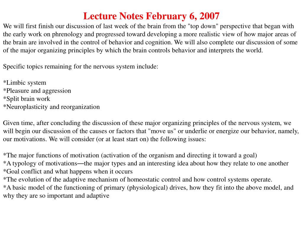 Lecture Notes February 6, 2007 We will first finish our discussion of last week of the brain from the "top down" perspective that began with the early work on phrenology and progressed toward developing a more realistic view of how major areas of the brain are involved in the control of behavior and cognition. We will also complete our discussion of some of the major organizing principles by which the brain controls behavior and interprets the world. Specific topics remaining for the nervous system include: *Limbic system *Pleasure and aggression *Split brain work *Neuroplasticity and reorganization Given time, after concluding the discussion of these major organizing principles of the nervous system, we will begin our discussion of the causes or factors that "move us" or underlie or energize our behavior, namely, our motivations. We will consider (or at least start on) the following issues: *The major functions of motivation (activation of the organism and directing it toward a goal) *A typology of motivations—the major types and an interesting idea about how they relate to one another *Goal conflict and what happens when it occurs *The evolution of the adaptive mechanism of homeostatic control and how control systems operate. *A basic model of the functioning of primary (physiological) drives, how they fit into the above model, and why they are so important and adaptive