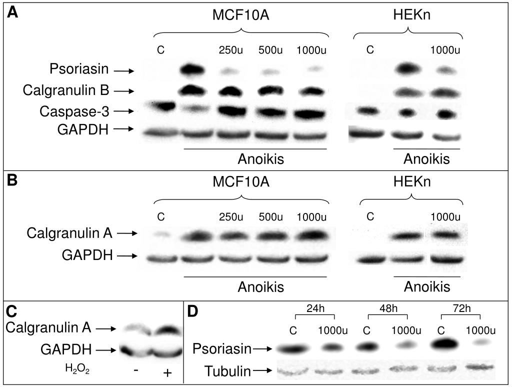 A HEKn MCF10A C C 250u 500u 1000u 1000u Psoriasin Calgranulin B Caspase-3 GAPDH Anoikis Anoikis B HEKn MCF10A C C 250u 500u 1000u 1000u Calgranulin A GAPDH Anoikis Anoikis D C 24h 48h 72h Calgranulin A 1000u 1000u 1000u C C C Psoriasin GAPDH - + H2O2 Tubulin