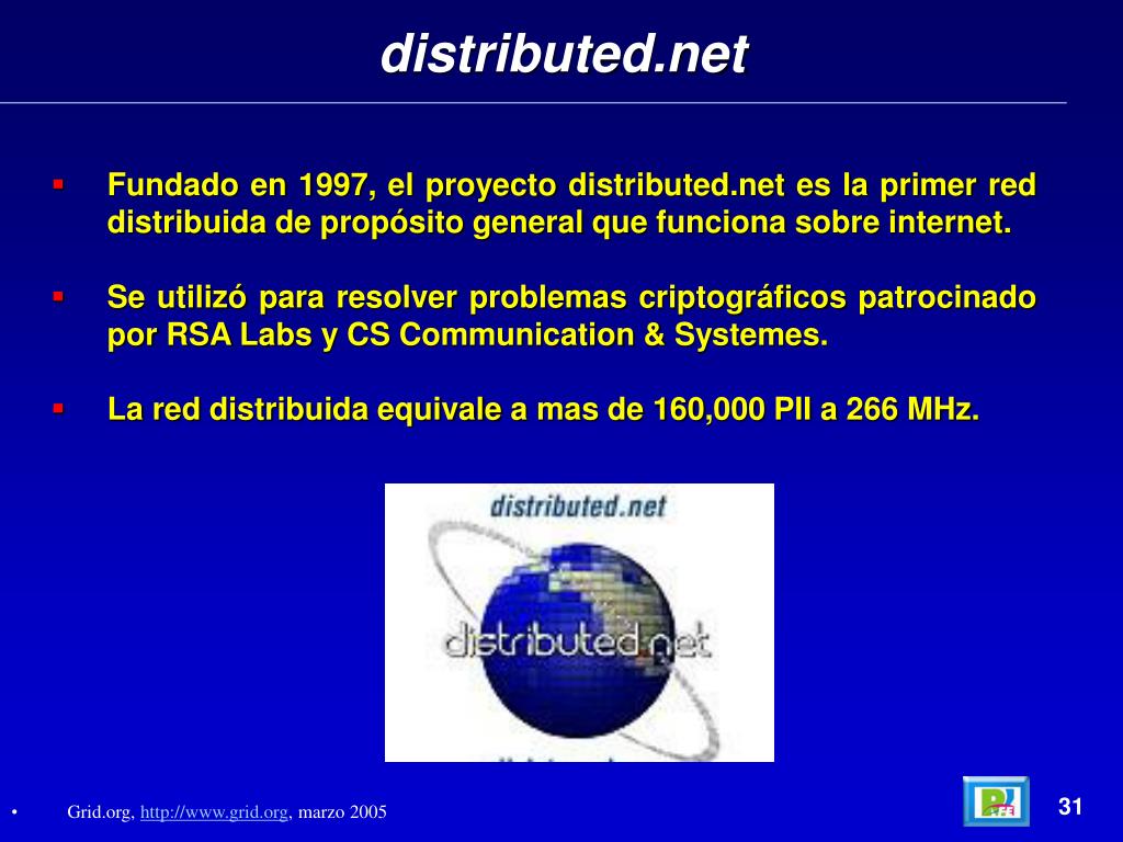 31 distributed.net • Fundado en 1997, el proyecto distributed.net es la primer red distribuida de propósito general que funciona sobre internet. • Se utilizó para resolver problemas criptográficos patrocinado por RSA Labs y CS Communication & Systemes. • La red distribuida equivale a mas de 160,000 PII a 266 MHz. • Grid.org, http://www.grid.org, marzo 2005