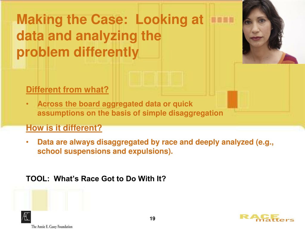 Making the Case: Looking at data and analyzing the problem differently Different from what? • Across the board aggregated data or quick assumptions on the basis of simple disaggregation How is it different? • Data are always disaggregated by race and deeply analyzed (e.g., school suspensions and expulsions). TOOL: What’s Race Got to Do With It?