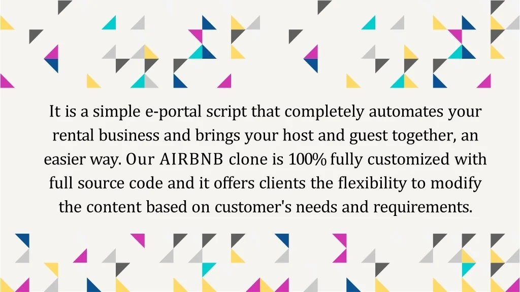Itisasimplee-portalscriptthatcompletelyautomatesyour rentalbusinessandbringsyourhostandguesttogether,an easierway. Our AIRBNBcloneis100%fullycustomizedwith fullsourcecodeanditoffersclientstheflexibilitytomodify thecontentbasedoncustomer'sneedsandrequirements.