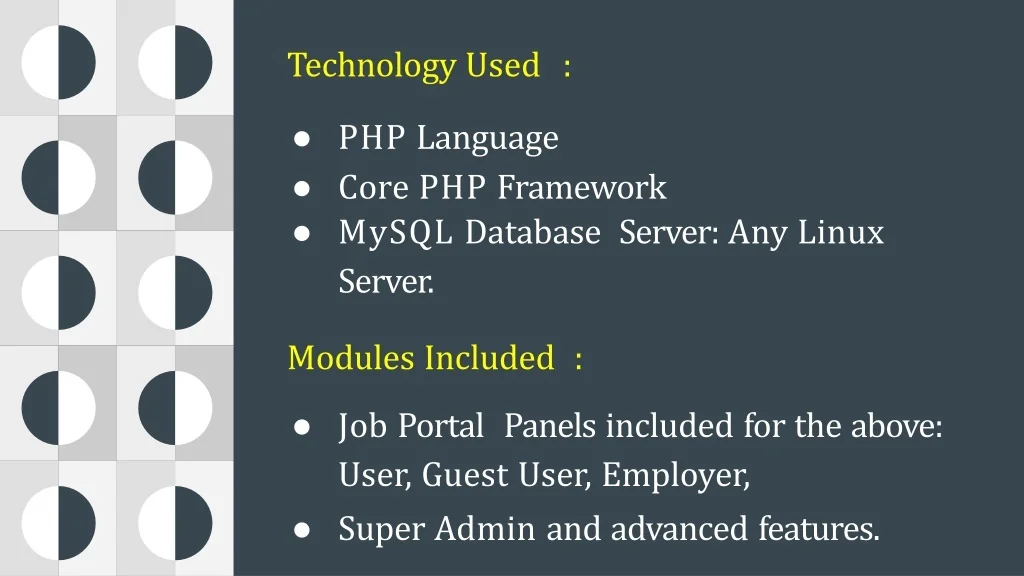 TechnologyUsed : • PHPLanguage • CorePHPFramework • MySQLDatabase Server:AnyLinux Server. • ModulesIncluded : • JobPortal Panelsincludedfortheabove: User,GuestUser,Employer, • SuperAdminandadvancedfeatures.