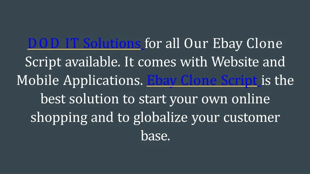 DODITSolutionsforallOurEbayClone Scriptavailable.ItcomeswithWebsiteand MobileApplications.EbayCloneScriptisthe bestsolutiontostartyourownonline shoppingandtoglobalizeyourcustomer base.