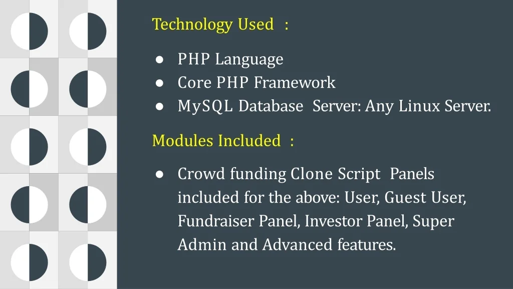 TechnologyUsed : • PHPLanguage • CorePHPFramework • MySQLDatabase Server: AnyLinuxServer. • ModulesIncluded : • CrowdfundingCloneScript Panels includedfortheabove:User,GuestUser, FundraiserPanel,InvestorPanel,Super AdminandAdvancedfeatures.