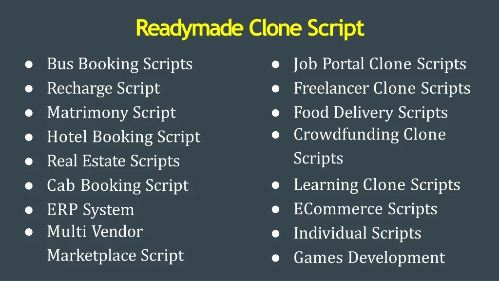 ReadymadeCloneScript • BusBookingScripts • RechargeScript • MatrimonyScript • HotelBookingScript • RealEstateScripts • CabBookingScript • ERPSystem • MultiVendor MarketplaceScript • JobPortalCloneScripts • Freelancer Clone Scripts • FoodDeliveryScripts • CrowdfundingClone Scripts • LearningCloneScripts • ECommerceScripts • IndividualScripts • GamesDevelopment