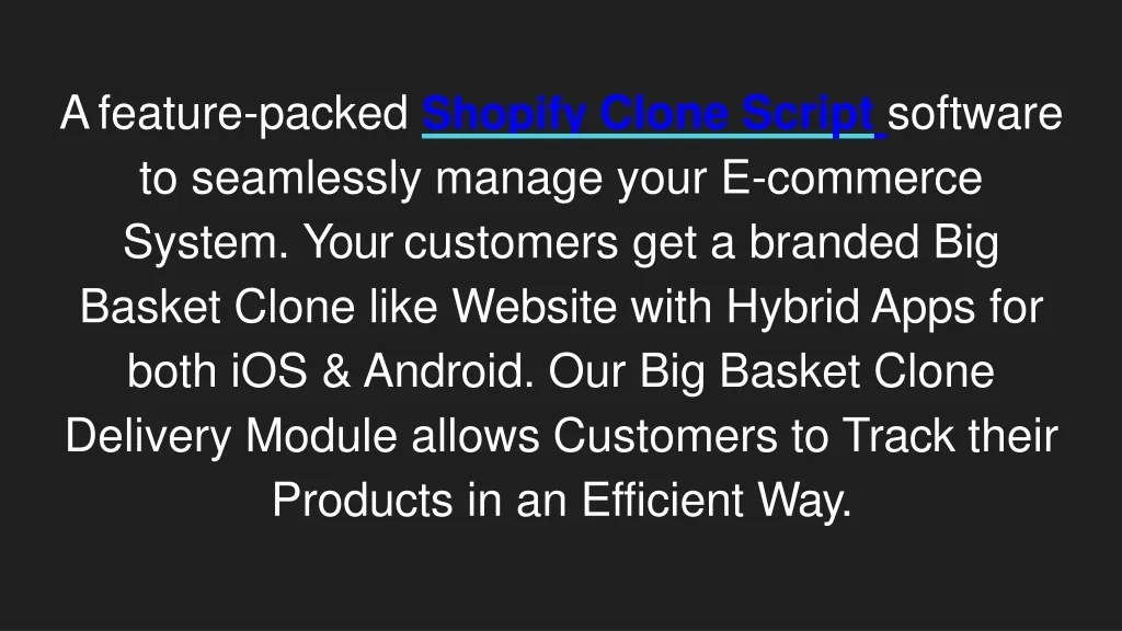 Afeature-packedShopify CloneScriptsoftware to seamlessly manage your E-commerce System. Your customers get a branded Big Basket Clone like Website with Hybrid Apps for both iOS & Android. Our Big Basket Clone Delivery Module allows Customers to Track their Productsin an EfficientWay.