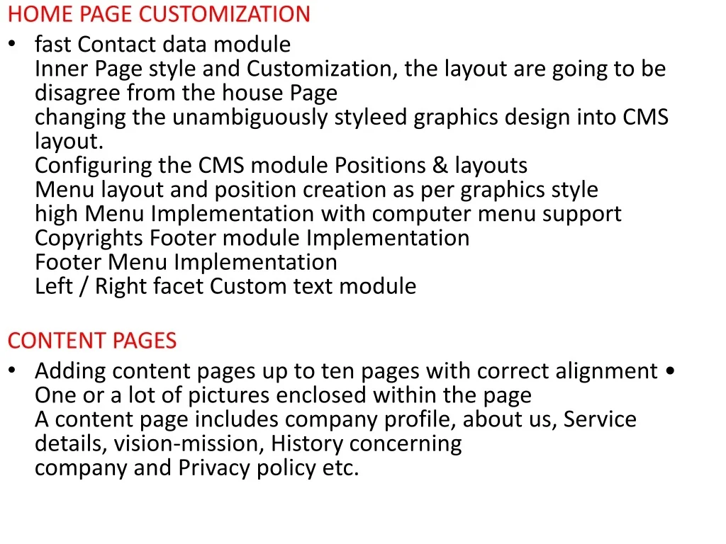 HOME PAGE CUSTOMIZATION • fast Contact data moduleInner Page style and Customization, the layout are going to be disagree from the house Pagechanging the unambiguously styleed graphics design into CMS layout.Configuring the CMS module Positions & layoutsMenu layout and position creation as per graphics stylehigh Menu Implementation with computer menu supportCopyrights Footer module ImplementationFooter Menu ImplementationLeft / Right facet Custom text module CONTENT PAGES • Adding content pages up to ten pages with correct alignment • One or a lot of pictures enclosed within the pageA content page includes company profile, about us, Service details, vision-mission, History concerningcompany and Privacy policy etc.