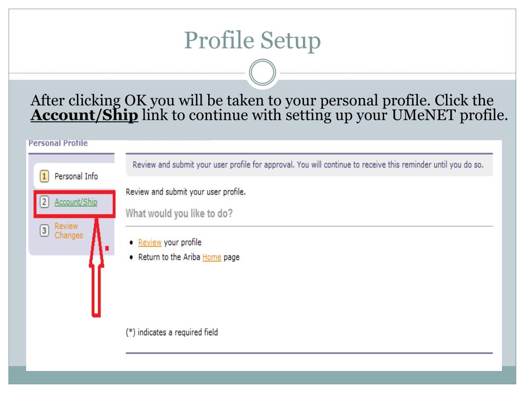 Profile Setup After clicking OK you will be taken to your personal profile. Click the Account/Ship link to continue with setting up your UMeNET profile.