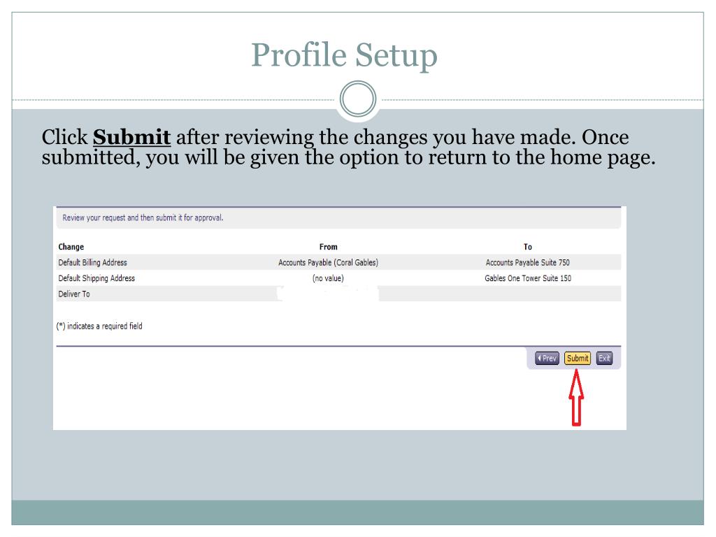 Profile Setup Click Submit after reviewing the changes you have made. Once submitted, you will be given the option to return to the home page.