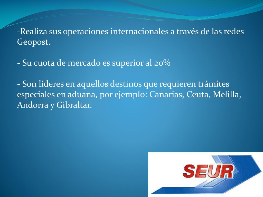Realiza sus operaciones internacionales a través de las redes Geopost. • - Su cuota de mercado es superior al 20% • - Son líderes en aquellos destinos que requieren trámites especiales en aduana, por ejemplo: Canarias, Ceuta, Melilla, Andorra y Gibraltar.